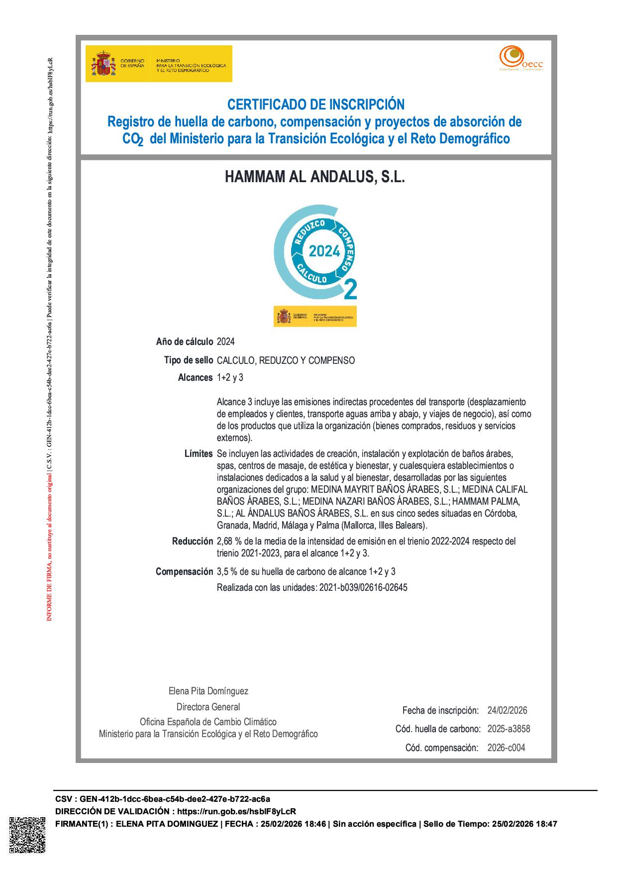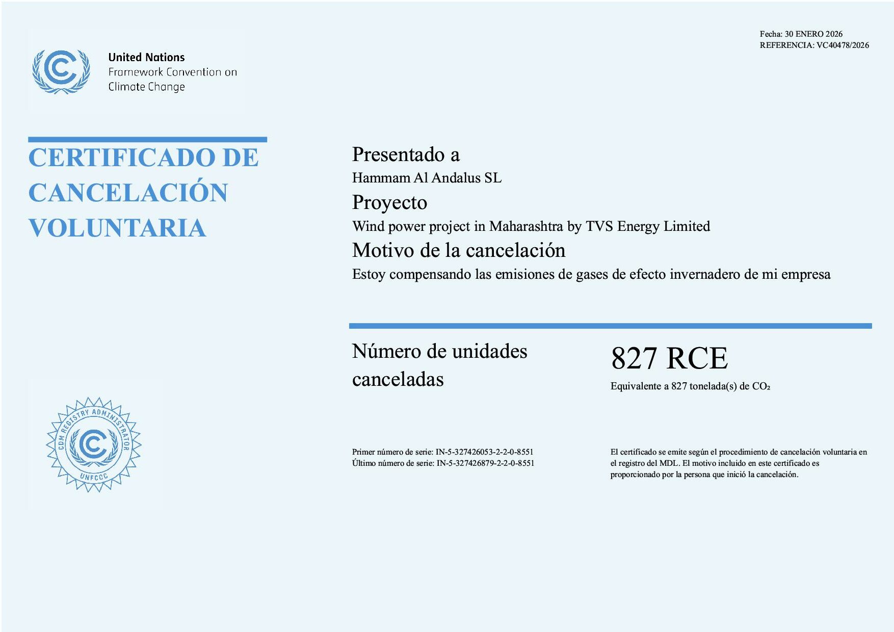 Puedes comprobar los certificados de nuestras inversiones en sumideros de CO2 que realizamos en la web de la Plataforma para la Compensación de la Huella de Carbono de las Naciones Unidas, así como en el Registro de Huella de Carbono, Compensación y Proyectos de Absorción de CO2 de la Oficina Española de Cambio Climático (OECC).